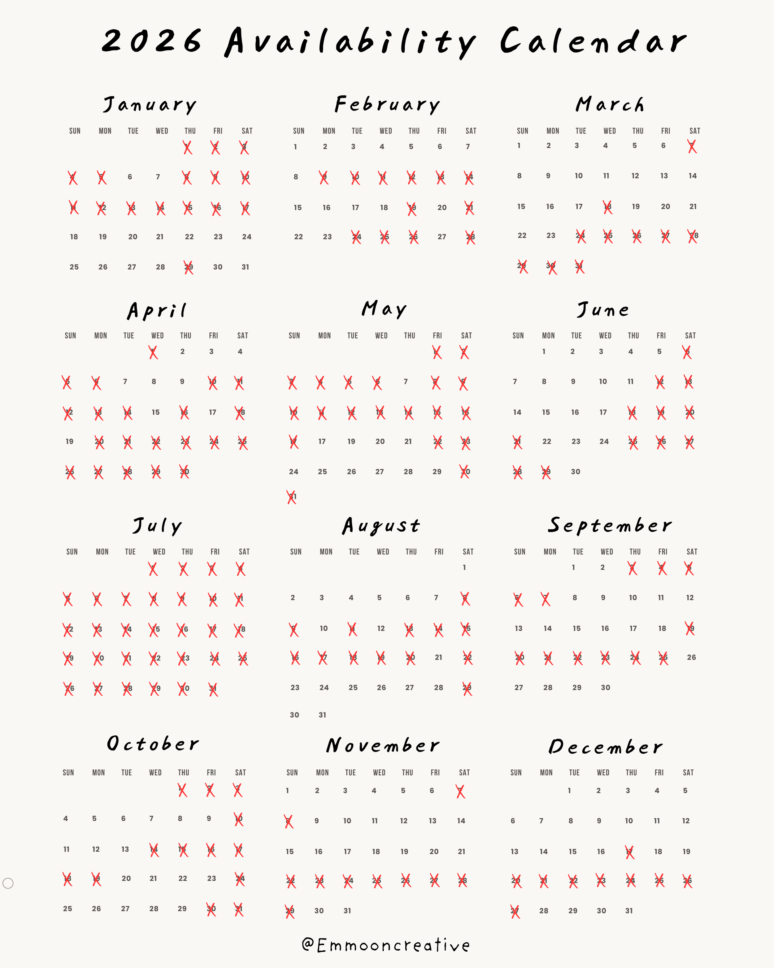 2026 Availability Calendar